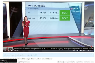 Kontynuując wątek wyników finansowych singapurskich banków, dzisiaj przed rozpoczęciem sesji giełdowej na SGX wyniki pokazało OCBC, natomiast wczoraj UOB. Tym samym za rok finansowy 2022 OCBC wygenerowało dochód na poziomie 11,6 mld S$ (wzrost 10% rok do roku), zysk operacyjny na poziomie 6,6 mld SGD (wzrost 14% rdr), zysk netto na poziomie 5,7 mld SGD, przy wskaźniku kredytów zagrożonych na poziomie 1,2%. ROE = 11,1%. Zysk na akcję = 1,27 SGD (wzrost 18% rdr).